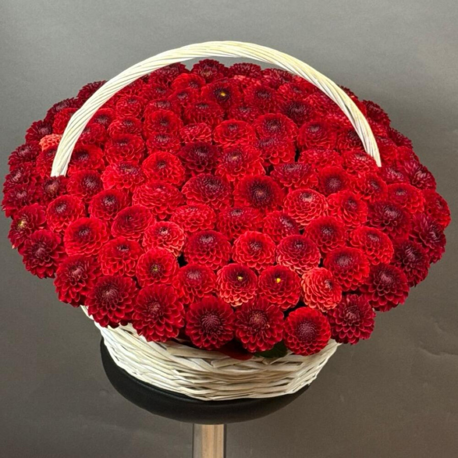 Композиция из 101 красной георгины в корзине в Киселёвске