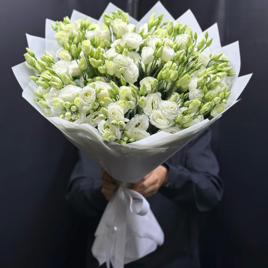 На фото букет 19 белых эустом. В составе: эустома (лизиантус) 19 шт, дизайнерская упаковка 3 шт, атласная лента 2 шт, . Все цветы свежие и ароматные, букет красиво оформлен и отлично подходит для подарка. Доступна доставка цветов или самовывоз.