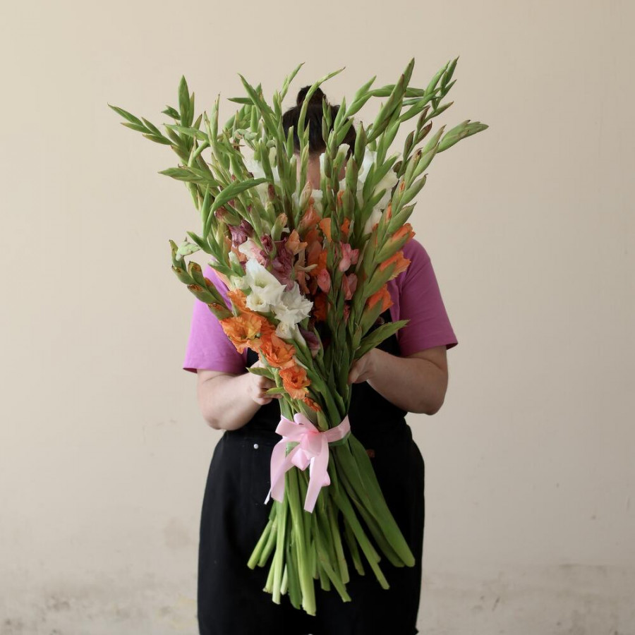 На фото букет из 25 микс гладиолусов. В составе: гладиолус 25 шт, атласная лента 1 шт, . Все цветы свежие и ароматные, букет красиво оформлен и отлично подходит для подарка. Доступна доставка цветов или самовывоз.