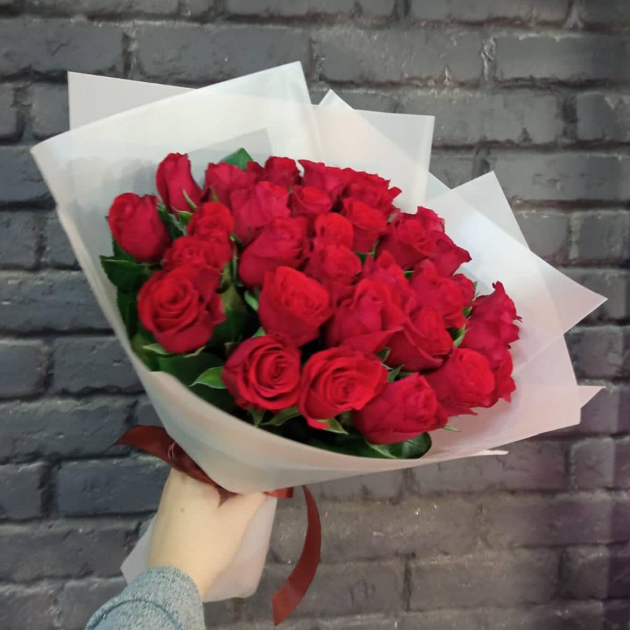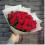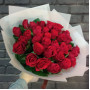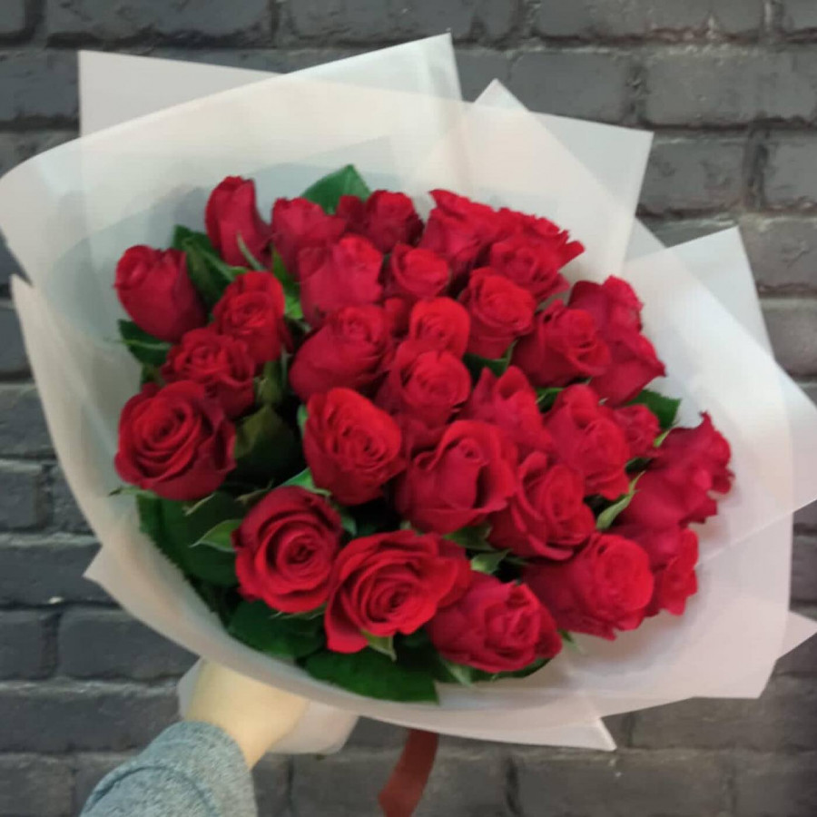 На фото букет из 33 красных роз. В составе: роза 33 шт, крафт-бумага 1 шт, атласная лента 1 шт, . Все цветы свежие и ароматные, букет красиво оформлен и отлично подходит для подарка. Доступна доставка цветов или самовывоз.