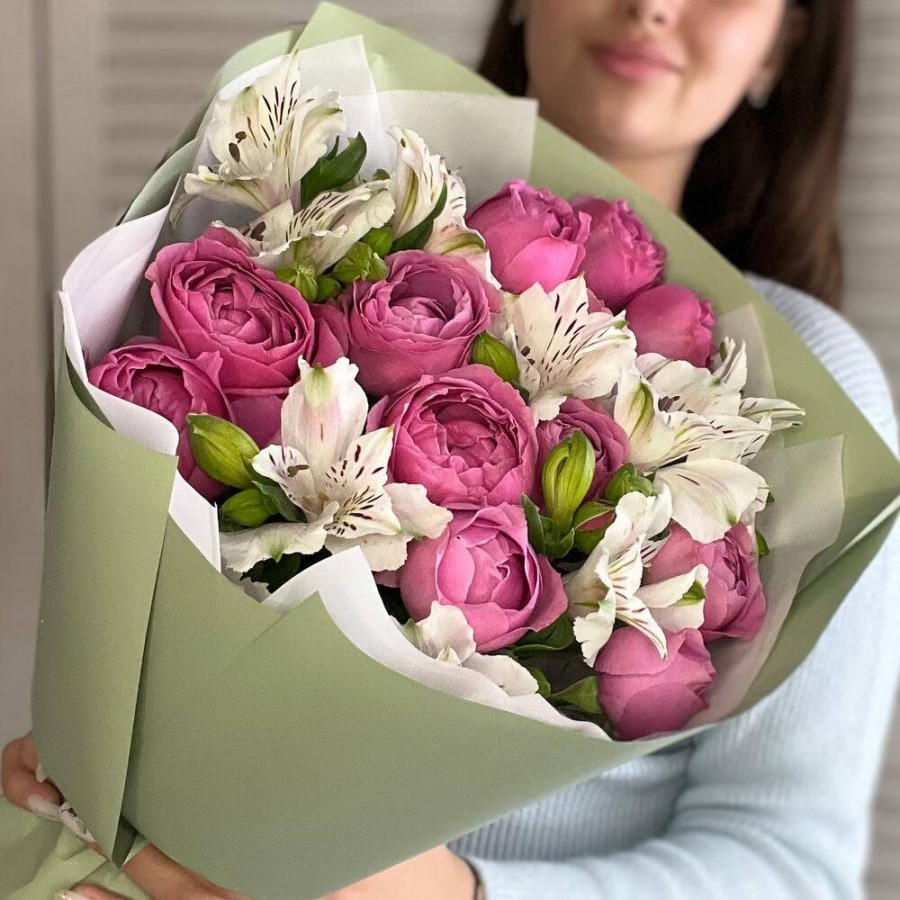 На фото букет «малиновая дымка». В составе: альстромерия 3 шт, кустовая пионовидная роза 4 шт, дизайнерская упаковка 2 шт, атласная лента 1 шт, . Все цветы свежие и ароматные, букет красиво оформлен и отлично подходит для подарка. Доступна доставка цветов или самовывоз.
