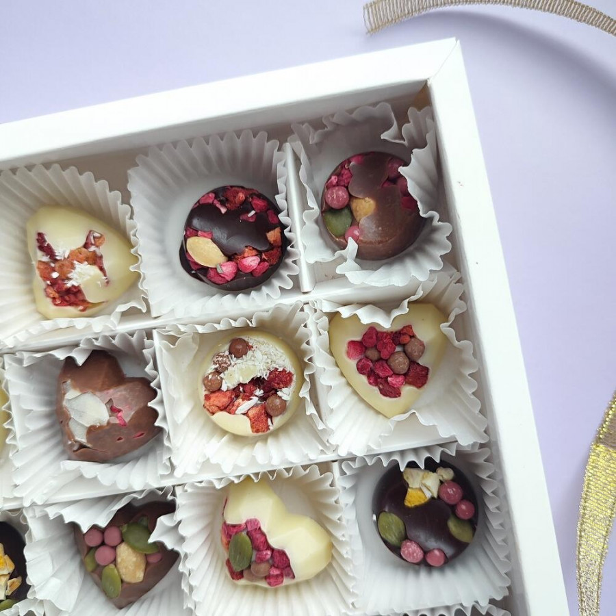 Состав : шоколад темный итальянский IRCA 48% , шоколад молочный Cargil 34%, шоколад белый 29% Cargil , сублимированная малина, клубника, абрикос, лимон, орех кешью, орех кокосовый стружка, орех арахис, орех миндаль, шоколадные шарики Callebaut клубничные, шоколадные шарики молочные, вафельная крошка, тыквенные семечки.