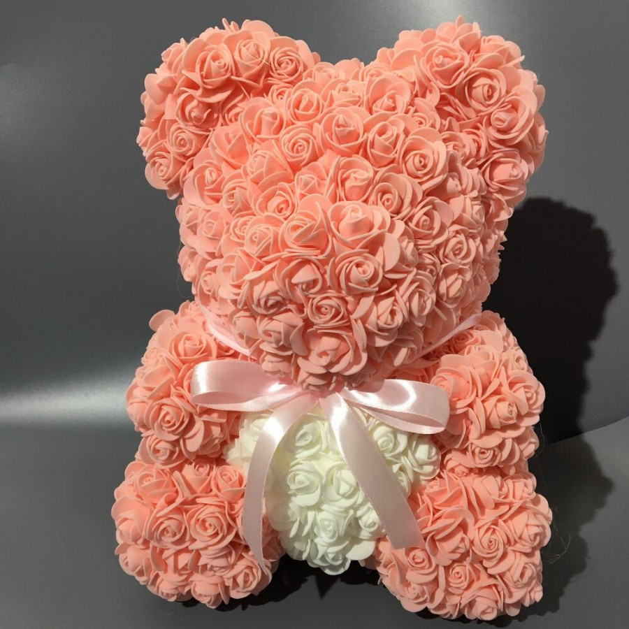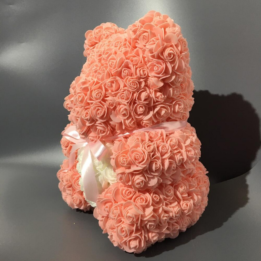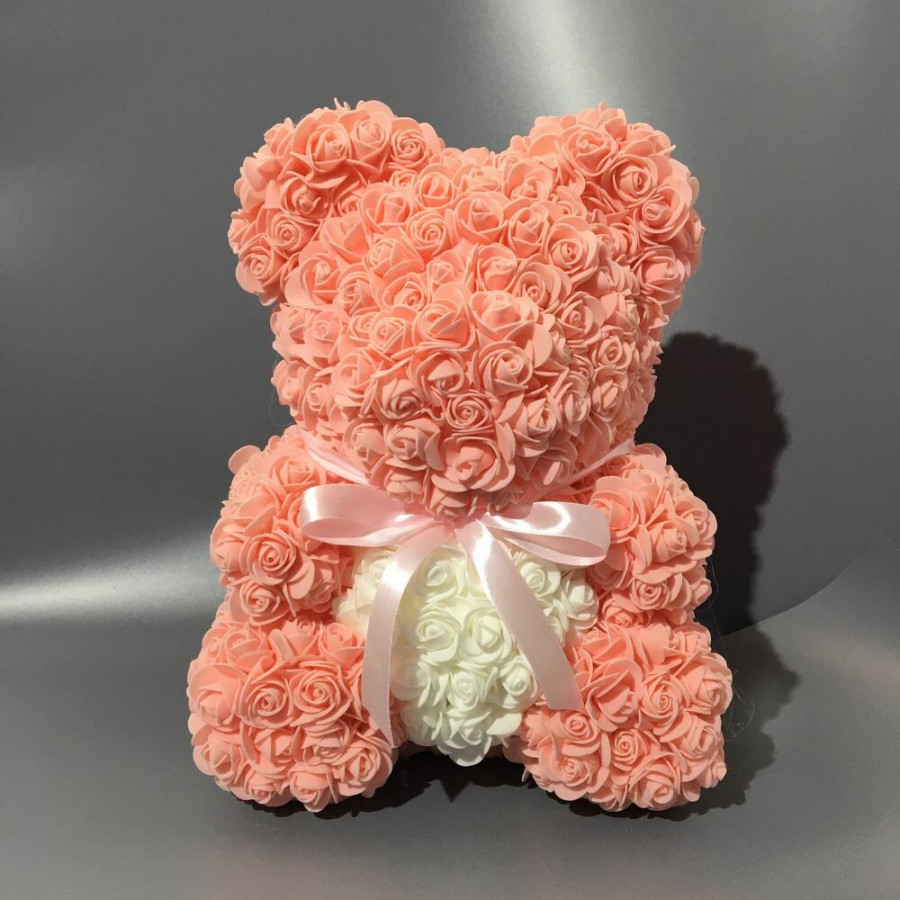 На фото мишка из роз «персик» 37 см. В составе: . Все цветы свежие и ароматные, букет красиво оформлен и отлично подходит для подарка. Доступна доставка цветов или самовывоз.